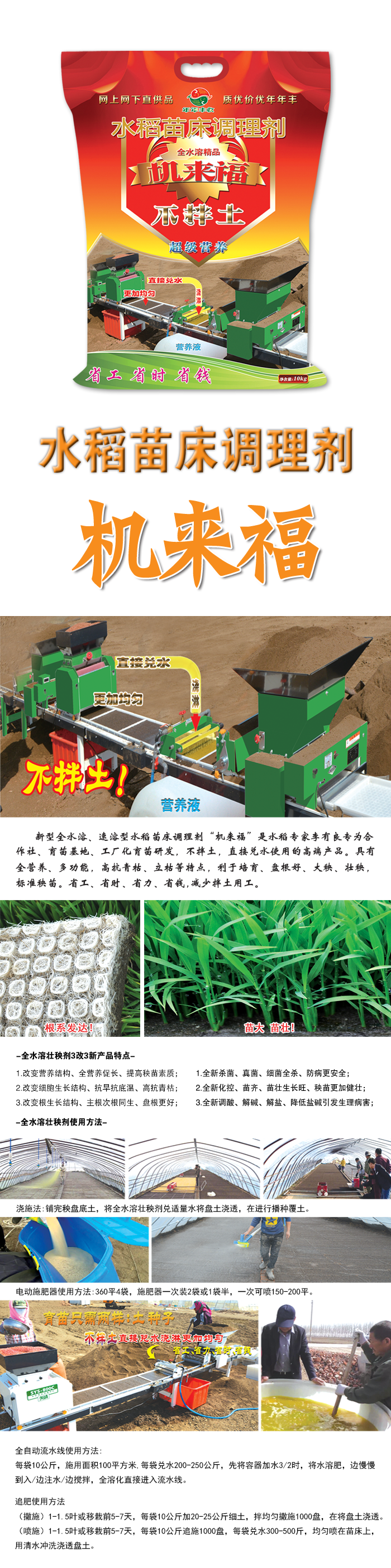 新型全水溶、速溶型水稻苗床調(diào)理劑“機(jī)來?!笔撬緦<依钣辛紝楹献魃?、育苗基地、工廠化育苗、機(jī)插秧育苗研發(fā),不拌土,直接兌水使用的高端產(chǎn)品。具有全營養(yǎng)、多功能,高抗青枯、立枯等特點(diǎn),利于培育、大秧、壯秧、盤根好,標(biāo)準(zhǔn)秧苗省工、省時(shí)、省力、省錢,減少拌土用工,降低育苗成本,使用更加方便。