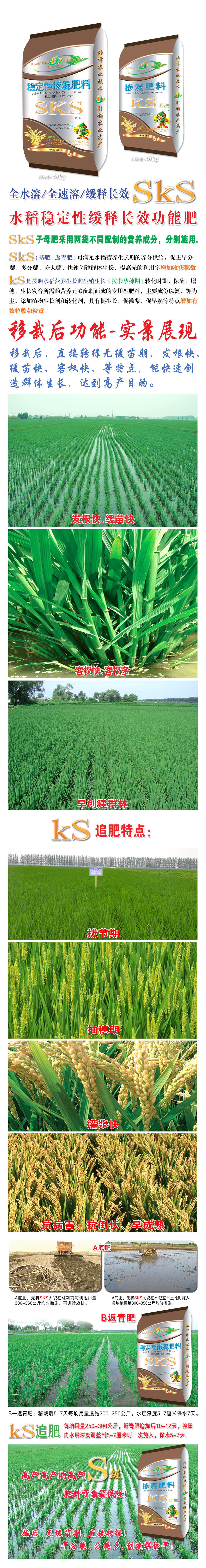 sks子母肥采用兩袋不同配制的營養(yǎng)成分,分別施用。sks (基肥.返青肥) 可滿足水稻營養(yǎng)生長期的養(yǎng)分供給,促進早分蘗、多分蘗、分大蘗、快速創(chuàng)建群體生長,提高光的利用率增加收獲穗數(shù)。