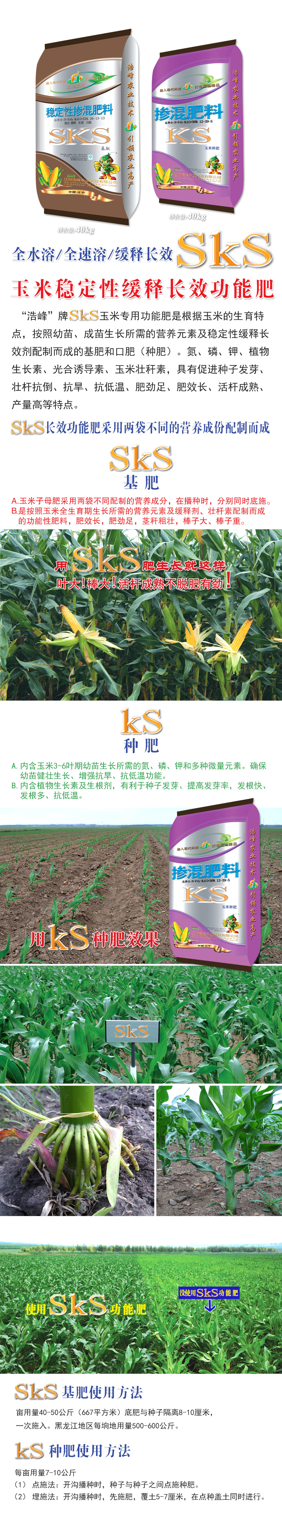 “浩峰”牌sks玉米專用功能肥是根據(jù)玉米的生育特點(diǎn),按照幼苗、成苗生長所需的營養(yǎng)元素及穩(wěn)定性緩釋長效劑配制而成的基肥和口肥(種肥)。氮、磷、鉀、植物生長素、光合誘導(dǎo)素、玉米壯稈素,具有促進(jìn)種子發(fā)芽、壯桿抗倒、抗旱、抗低溫、肥勁足、肥效長、活桿成熟、產(chǎn)量高等特點(diǎn)。