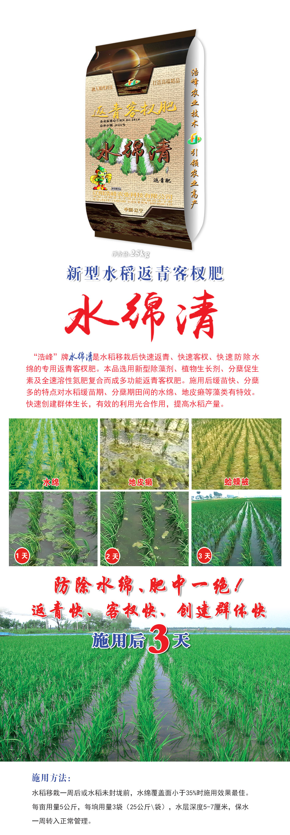 “浩峰”牌      是水稻移栽后快速返青、快速客杈、快速防除水綿的專用返青客杈肥。本品選用新型除藻劑、植物生長(zhǎng)劑、分蘗促生素及全速溶性氮肥復(fù)合而成多功能返青客杈肥。施用后緩苗快、分蘗多的特點(diǎn)對(duì)水稻緩苗期、分蘗期田間的水綿、地皮癩等藻類有特效??焖賱?chuàng)建群體生長(zhǎng),有效的利用光合作用,提高水稻產(chǎn)量。